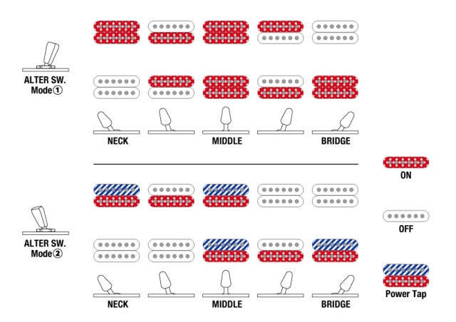 HHモデル…リアルなシングルコイルサウンドを実現するPower Tapモードへの切り替えとなります。片方のコイルはタップさせ、もう片方のコイルの低音域を生かす特殊配線が施された、ただのタップでは得られないクリアな高音域と太くて輪郭のハッキリしたサウンドが特長です。