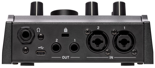 IN 1、2端子(XLR / 6.3mmTRSモノラルフォーンジャック)、OUT 1、2端子(6.3mmTRSモノラルフォーンジャック)、(USB)端子(Type -C)、 (ヘッドホン)端子(6.3mmステレオフォーンジャック)