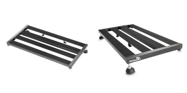 軽いアルミレール使用したペダルボードです。前方にゴム足を配して傾斜を付け、高さが調節できます。ボード上面にはあらかじめベルクロが張られていてすぐにレイアウトが可能です。底裏面にはACアダプターを配置できゴムバンドで固定する構造です。ボードはポケットつきのソフトケースに収められます。