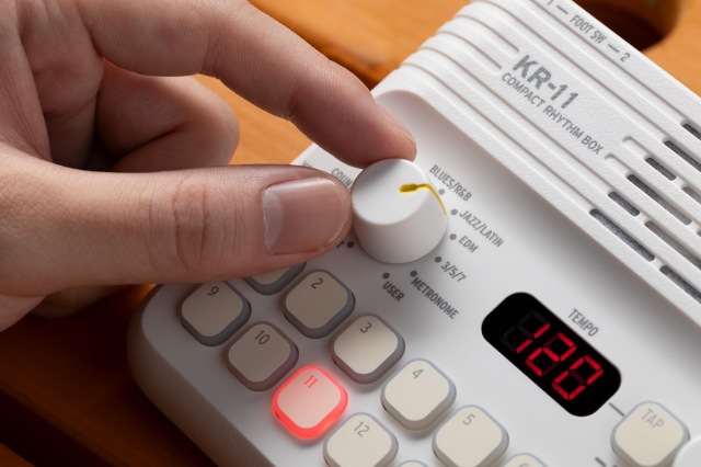 1963年に発売された国内初のリズム・ボックスである「ドンカマチック」から続くコルグ・リズム・ボックス・シリーズよりKR-11の登場です。ポップでポータビリティーに優れ、ジャンルのツマミを回して、バリエーション・ボタンを押すだけの簡単な操作で126種類もの様々なリズム・パターンがあなたの楽器練習や演奏に新たな楽しみをもたらします。便利なタップ・テンポ機能やスウィング機能も搭載。また、パッドを叩いて自分のお気に入りのリズム・パターンを作成し、保存することも可能。ペダル・スイッチでパターン・チェンジなどパフォーマンス性にも優れたKR-11は活躍の場を選びません。